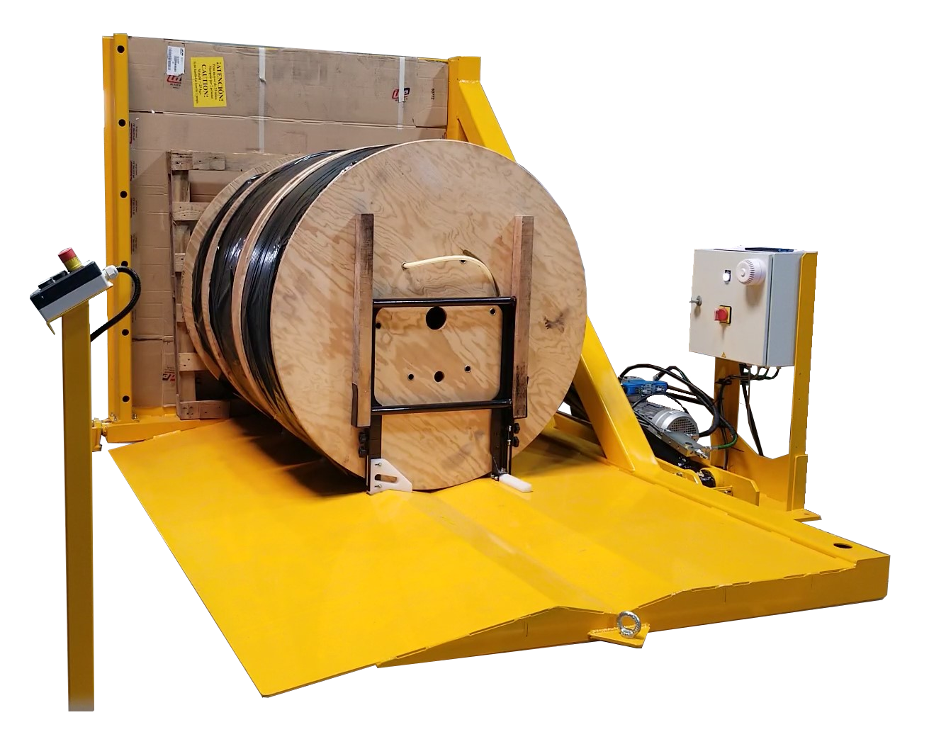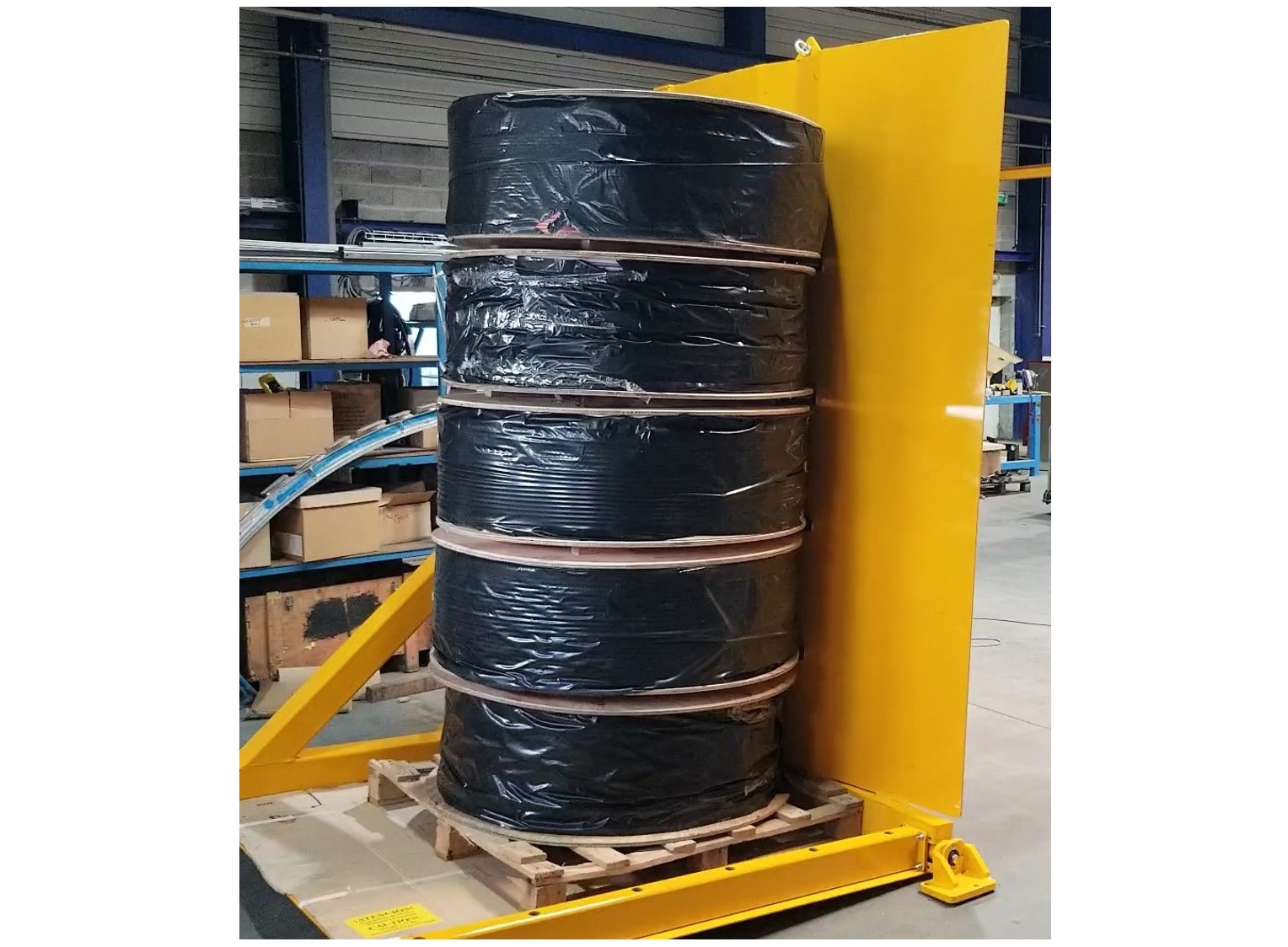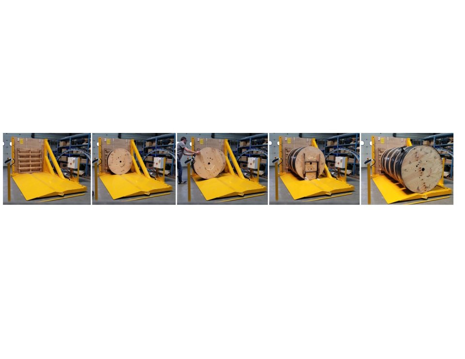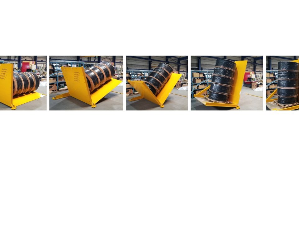 La maîtrise parfaite du centrage de chaque touret est la clé de la stabilité des palettes pendant et après basculement. Le tablier entrant de ce basculeur a été spécialement façonné pour obtenir un alignement exact des mini-bobines.
