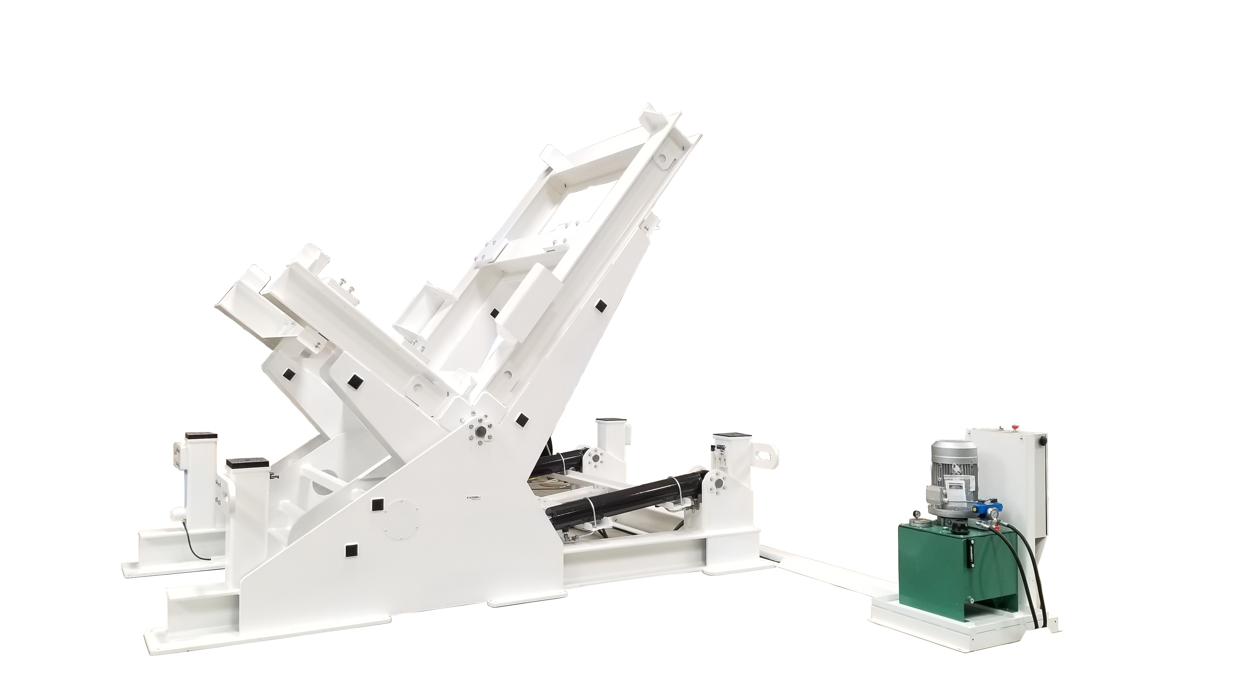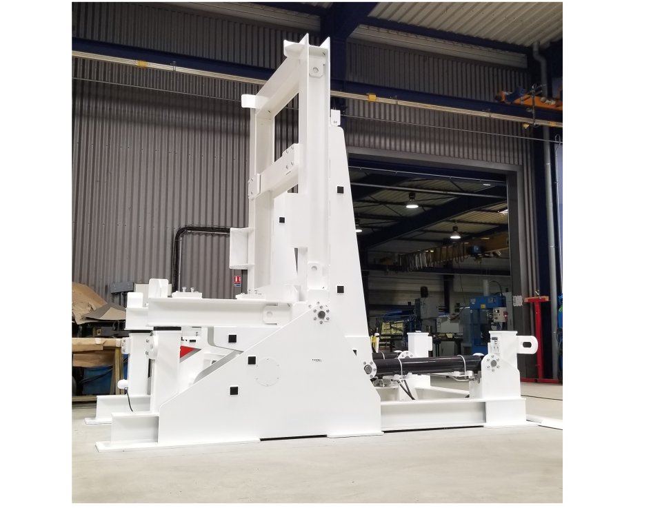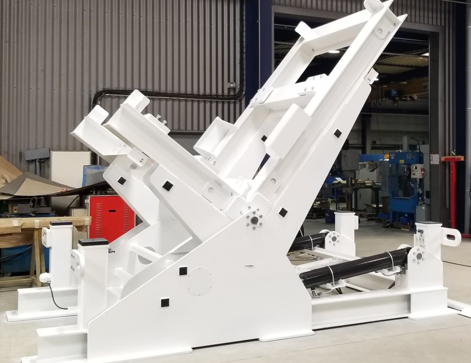 Equipé d’un puissant système hydraulique et d’une structure très robuste, ce basculeur est capable de tourner de 90° des sous-ensembles mécaniques hors normes, tel que des pompes, des turbines ou bien encore des moteurs… Ses capacités sont impressionnantes :