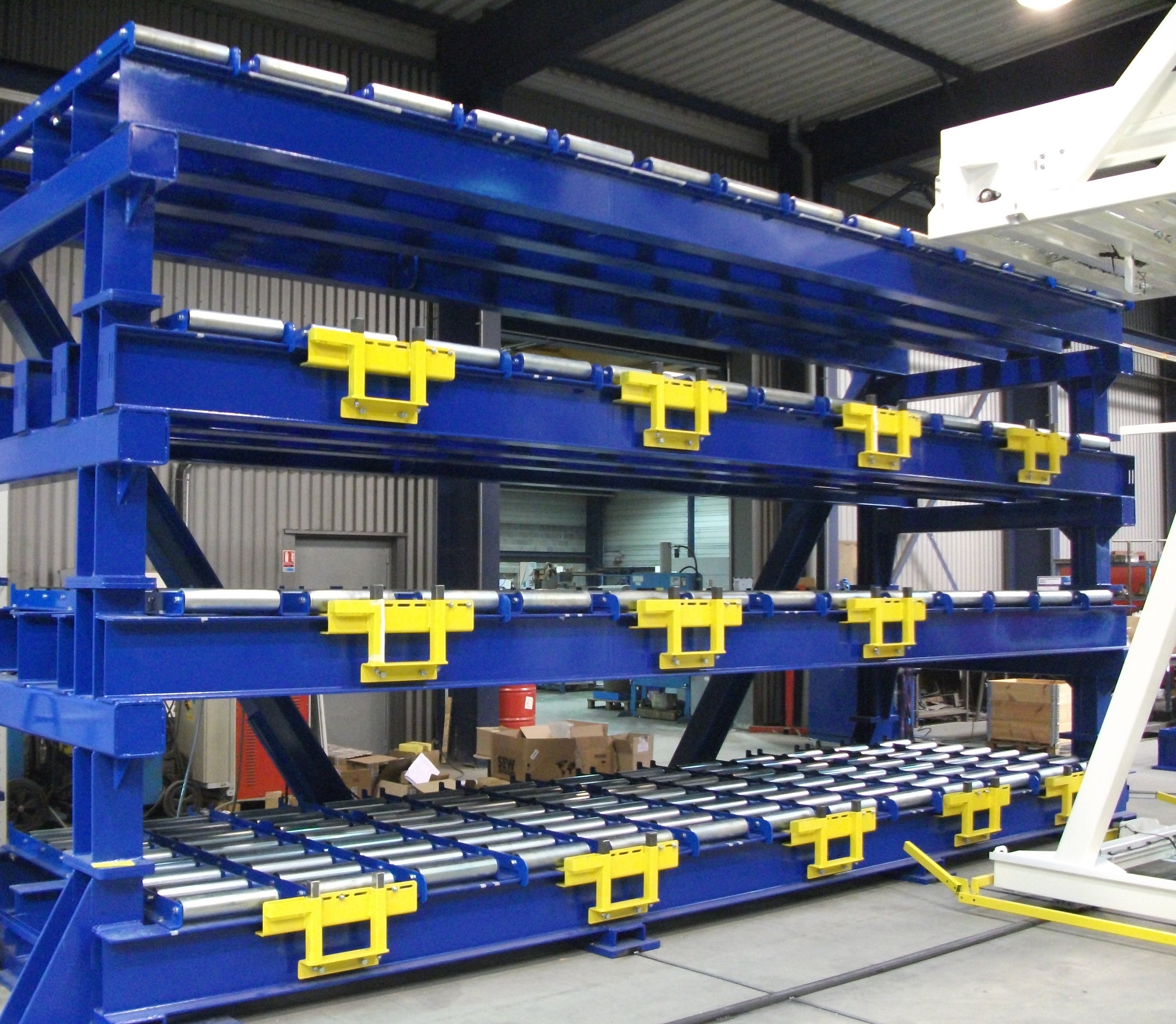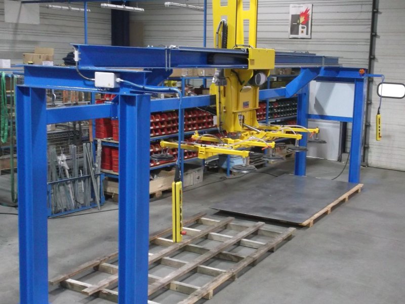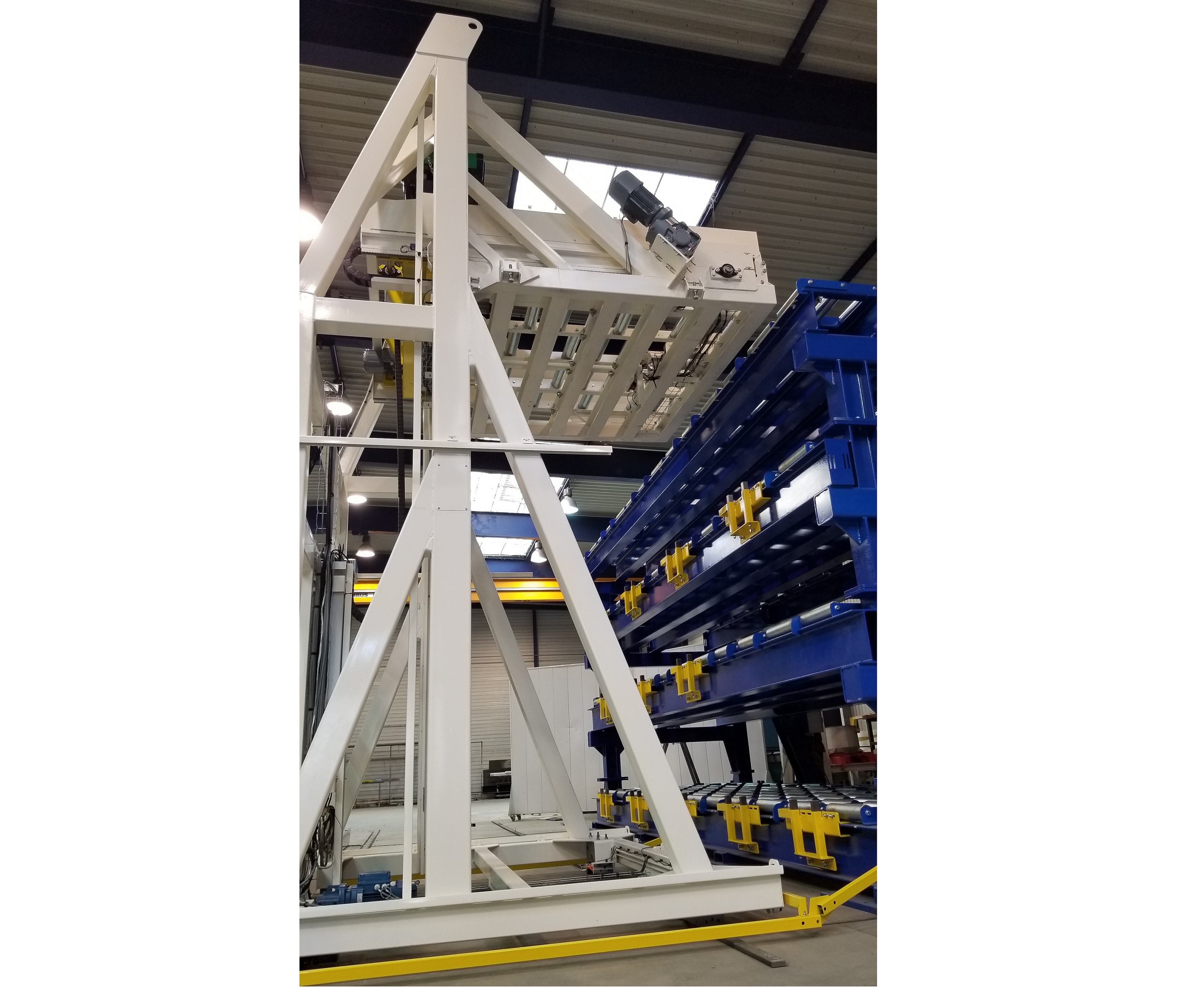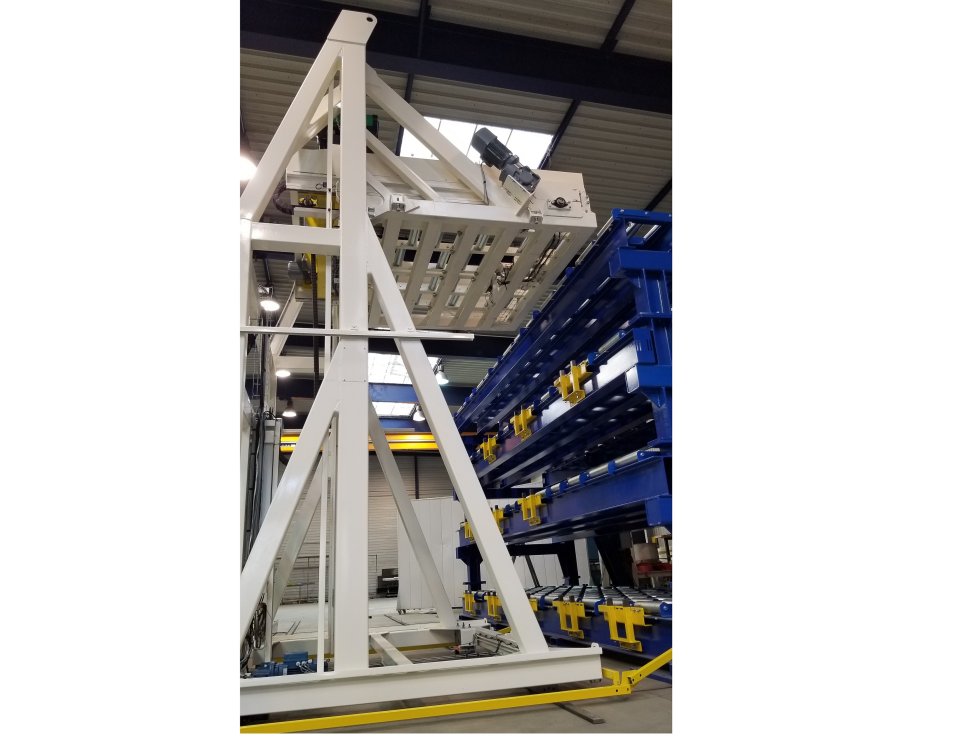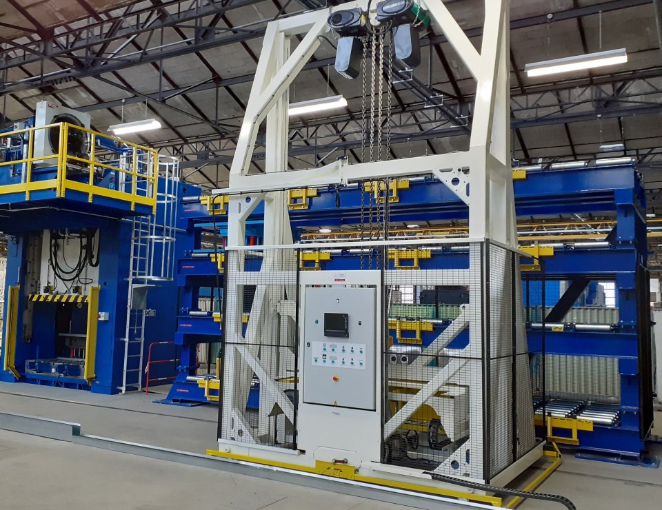 Mobile sur deux rails au sol, il se déplace à la demande et vient se positionner devant la presse. Son système d'assistance électronique permet de garantir un positionnement précis.