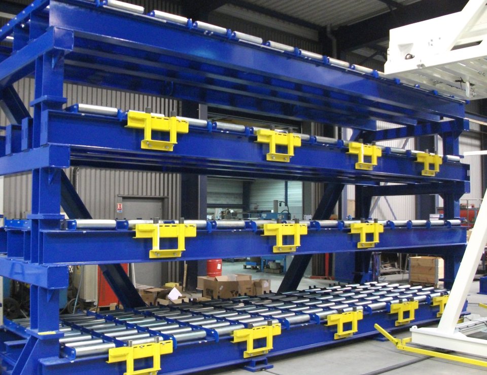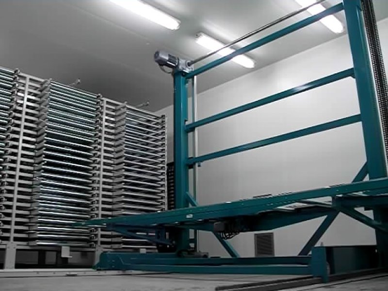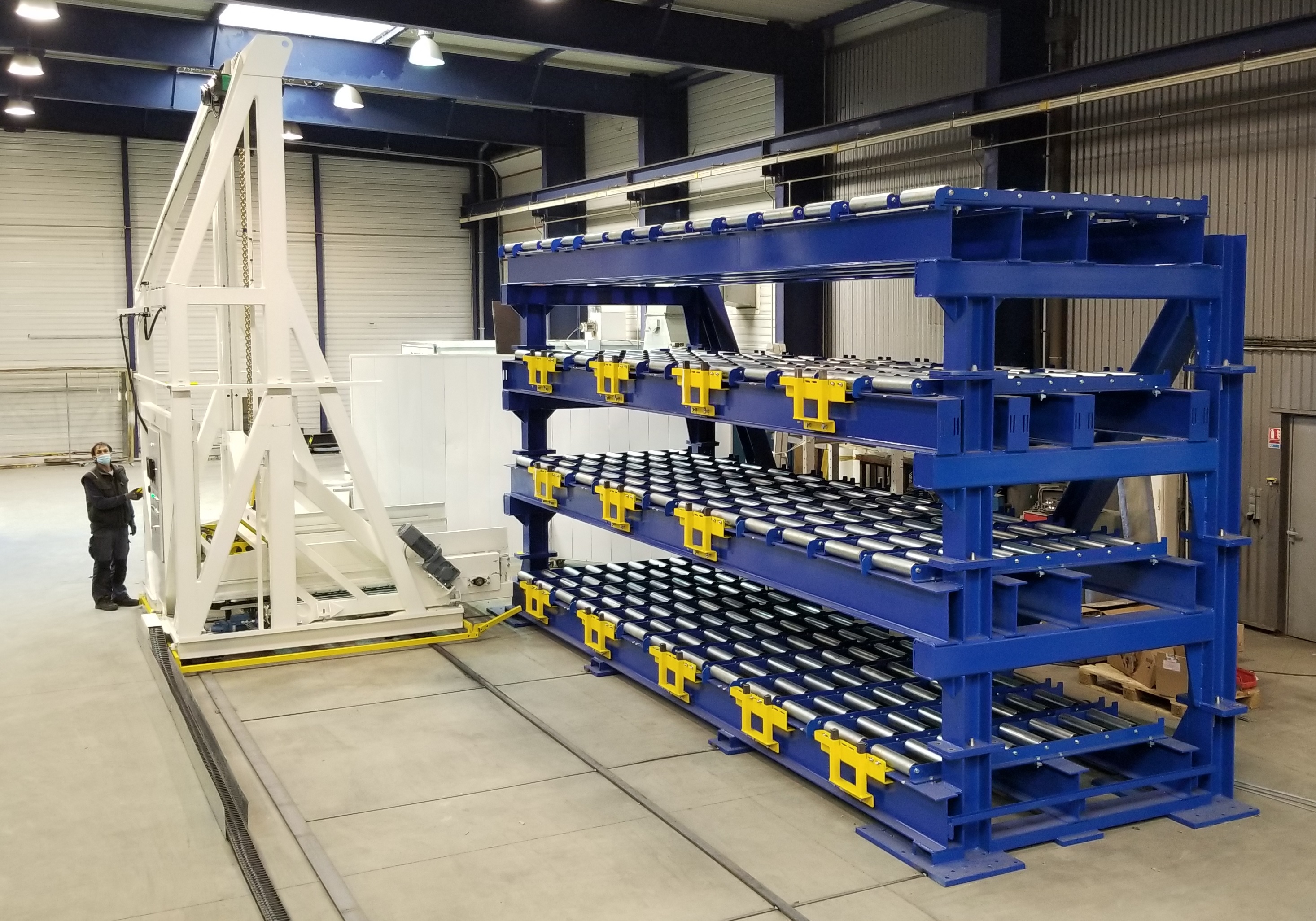 Le changeur de moules est chargé de manutentionner les outillages entre le stockage et la presse. Il est aussi capable d'intégrer de nouveaux moules ou à l'inverse de sortir du stock des moules obsolètes ou nécessitant une phase de maintenance.