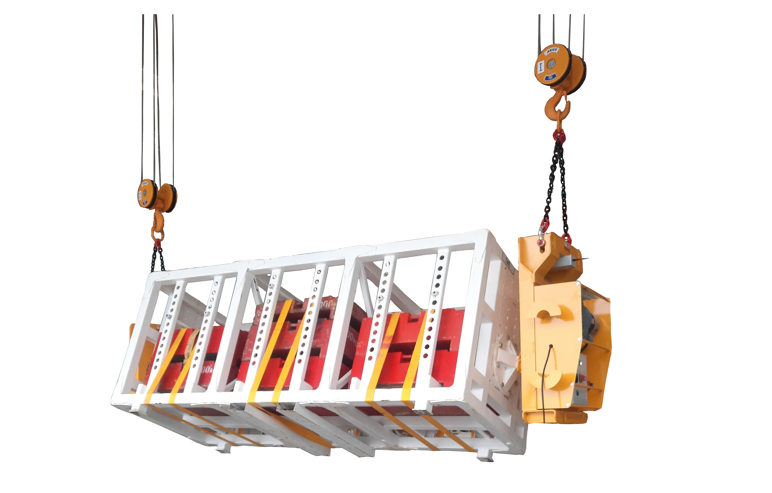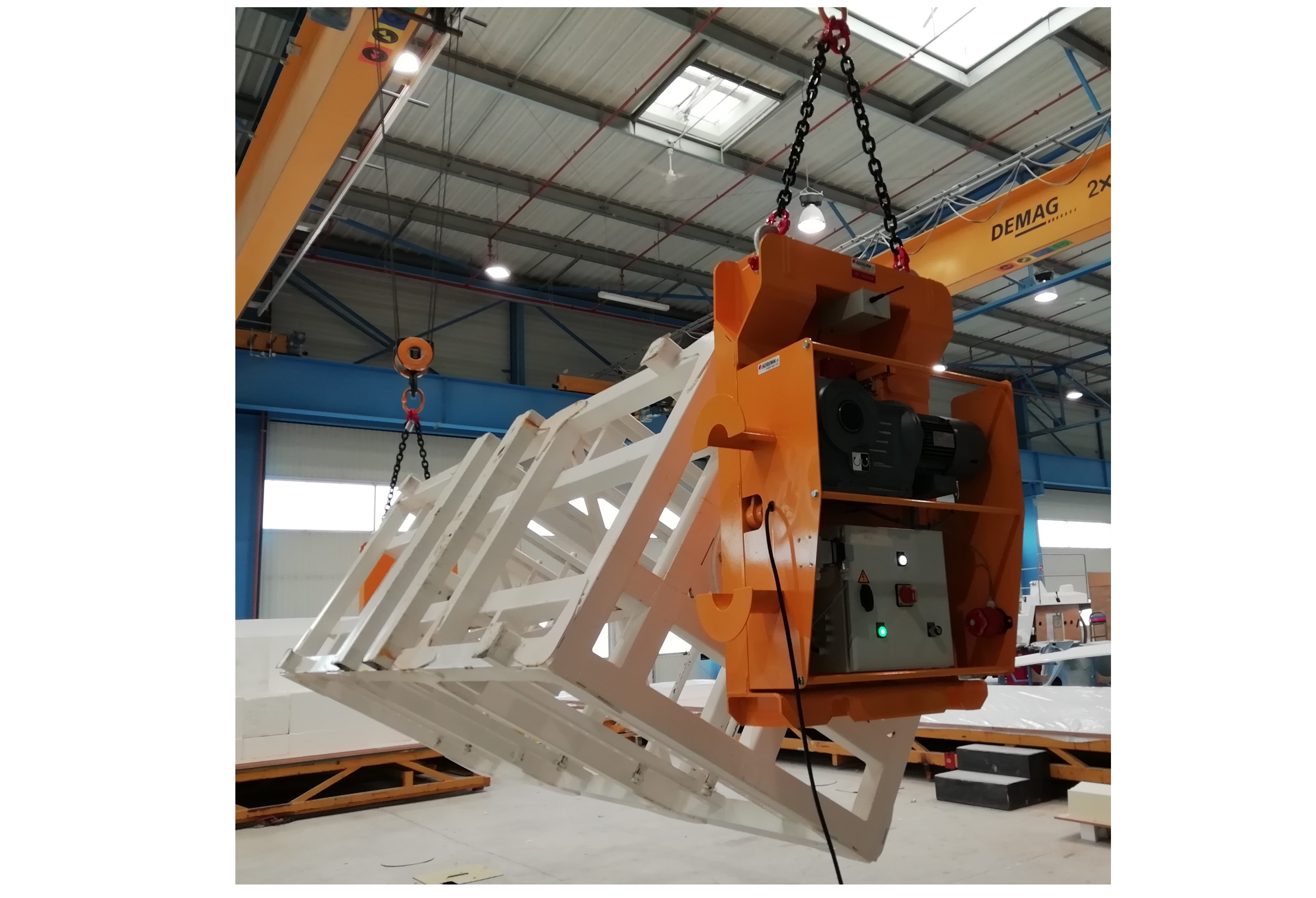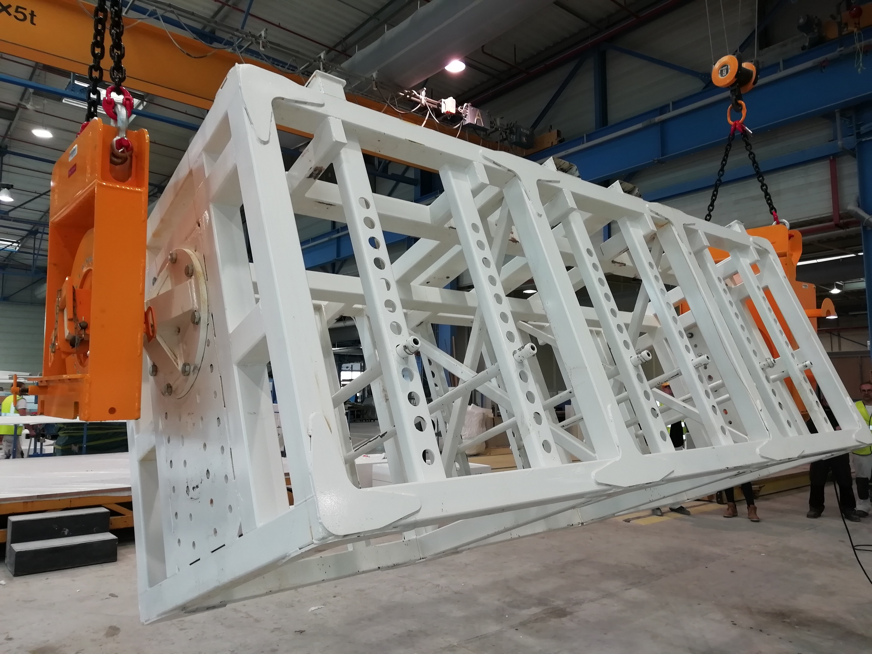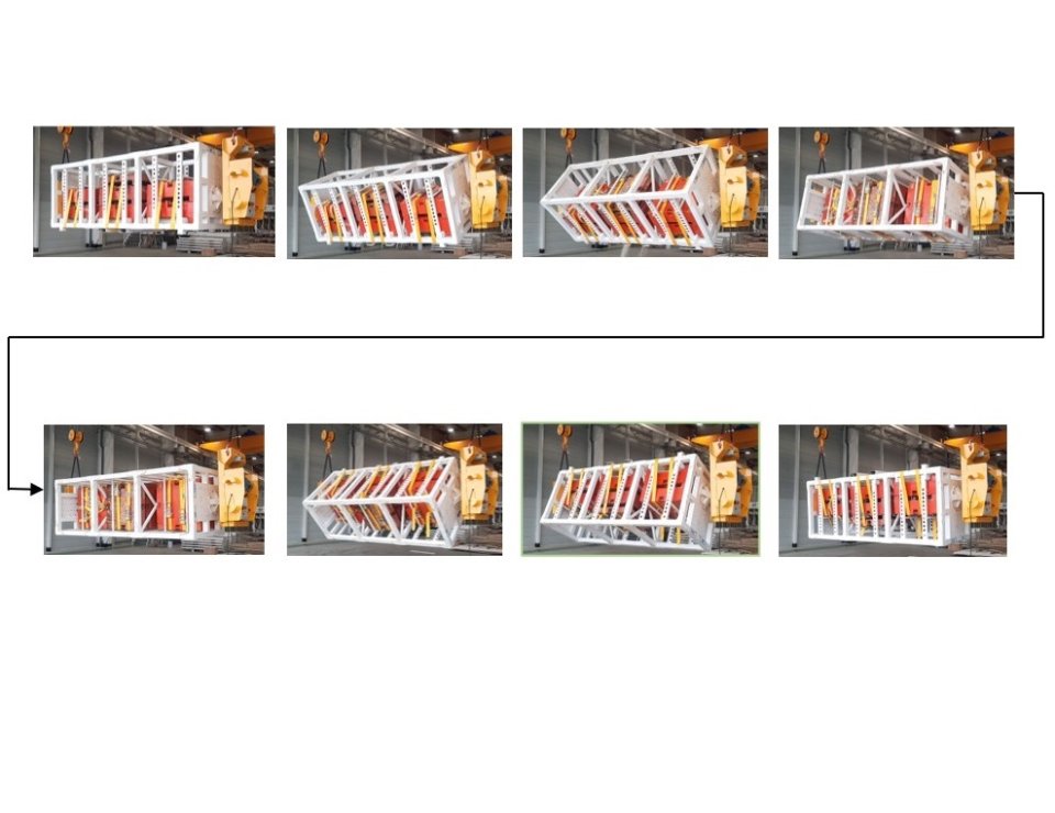 Et c’est bien là que réside le premier grand avantage de ce retourneur de moules : sa capacité à retourner des produits ultra-longs. Comment ? Grâce à l’indépendance complète de ses deux systèmes de retournement. Suspendus chacun par son propre anneau de levage aux crochets d’un double pont ou d’une double grue, ils peuvent être écartés ou rapprochés à loisir sans nécessiter la moindre adaptation mécanique.
